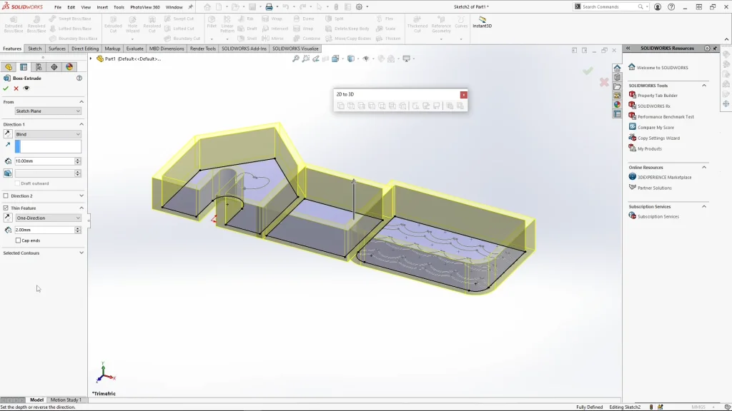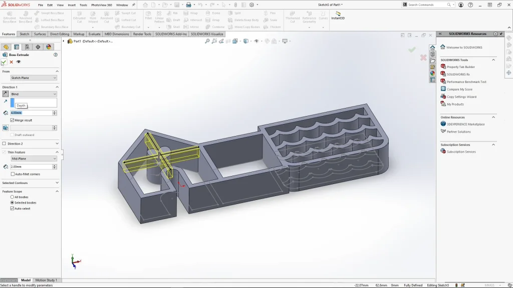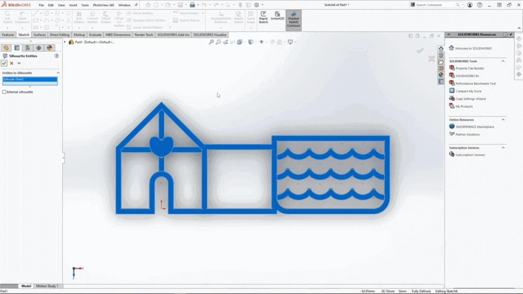 In a new part, I can bring in the DXF file and under import options, I can keep the DXF sketch as a reference sketch so it can not be changed. This removes the need to fully define the sketch, I already know the dimensions as defined in the original house model. I then use the DXF as a guide sketch to create the outline of the cutter, for this part I used a combination of convert entities and convert silhouette. Thin feature was used to create most of the model.