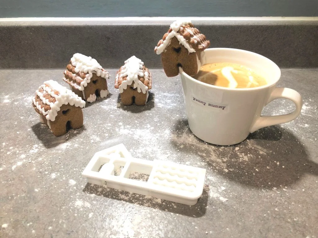 One tip when using your 3D printed cutters is to flour them before each cut, this keeps them dry and stops the dough getting stuck. I loved this mini project, I really enjoy baking and I especially enjoy eating gingerbread. For my house, I used a gingerbread dough, but I have seen sugar cookie dough used too, just ensure you use a strong icing for joining up your pieces together, I used a simple royal icing, which is just egg whites and icing sugar. Have fun!