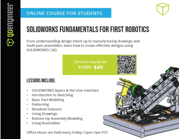 This year, GoEngineer is expanding their online education offering to FIRST students with their online SOLIDWORKS Fundamentals for FIRST Robotics Course.