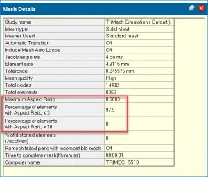 Since a mesh is nothing more than an approximation of your geometry broken down in to tiny pieces, it is reasonable to have some not exactly perfect elements in your model. In other words, a good mesh won’t be made up entirely of perfectly shaped elements. A good mesh will, however, have nearly all of its elements with a small aspect ratio or a value less than 3. Although this won’t always be possible especially with larger more complicated models. So keep in mind when doing any subsequent levels of mesh refinement it might not be worth the time investment to improve just a handful of elements out of the thousands in the entire model.