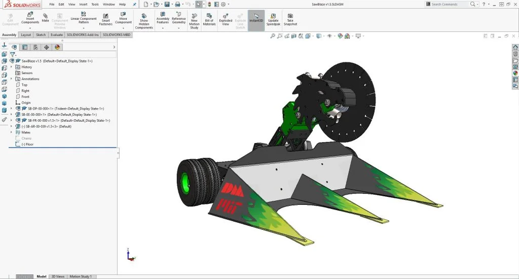 SawBlaze was designed completely in SOLIDWORKS. Mass properties ensured we would not exceed the 250-pound weight restriction and verified that our center of gravity was located properly for all orientations of the robot. The 3D sketch tools and sheet metal toolbox were invaluable for creating the front plow geometries. SOLIDWORKS generates a bill of materials (BOMs), which we used to generate checklists for spares and fasteners. We also used SOLIDWORKS to create drawings to contract out some of the larger components that we cannot fabricate at MIT. We have a sheet format that preserves all the critical information so that we can hit consistent tolerances on spare components despite switching suppliers between seasons.