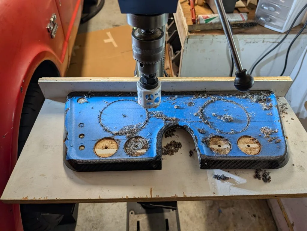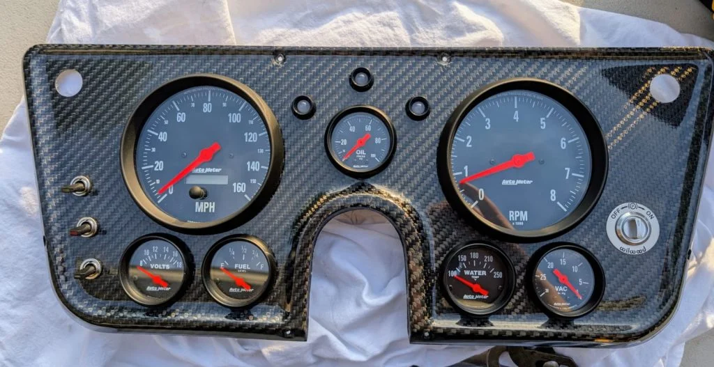Each hole was drilled to size, erring slightly on the smaller side, with some hand-fitting with a file to keep the gauges snug. When the tape came off, it was glorious. The custom panel dropped into the dash like it belonged there from day one.