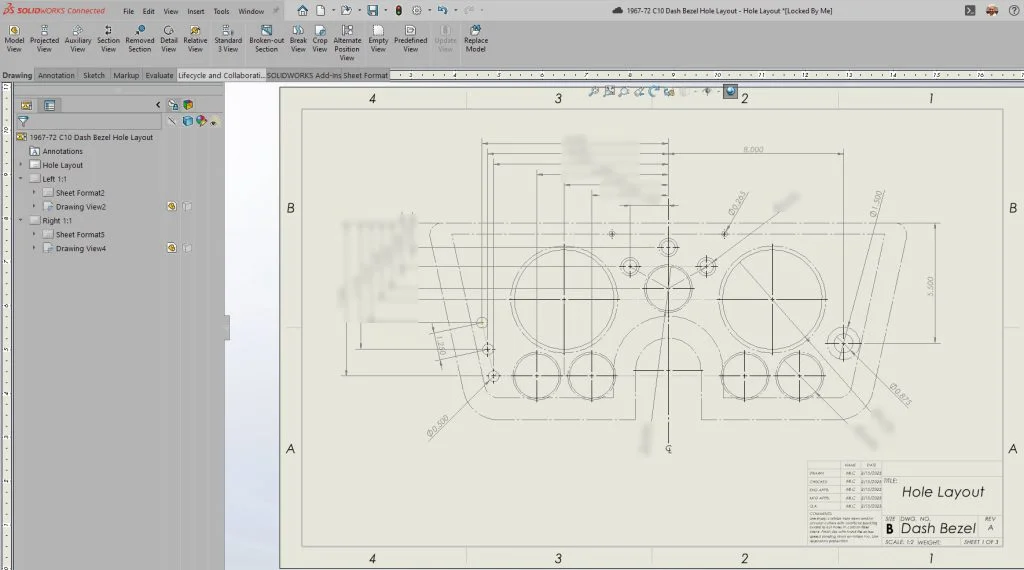 “It’s far easier to drag elements around on-screen than it is to move a hole in real life,” Matt says. “With CAD, you can try several different layouts without wasting a single piece of material. When you have a part like this dash blank with multiple curves and edge offsets, printing out a 1:1 check template is by far the fastest way to check your ideas out in the shop before committing with a five-inch hole saw.”