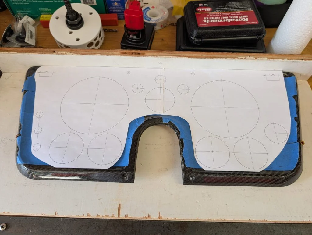 Once Matt had a layout he liked, he printed it full-size, cut it out, and taped it to the blank carbon fiber dash. It’s a good example of CAD working together with a simple paper template. From the driver’s seat, he could check sight lines in seconds and spot anything that might be hidden behind the wheel.