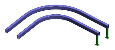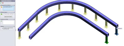 Let’s use this conveyor example to show a few options. In this example, I want to pattern a Sub-Assembly that contains the leg and a foot plate part. My goal is to use a curve to pattern this Sub-Assembly around the curved conveyor rail within this Top Level Assembly.