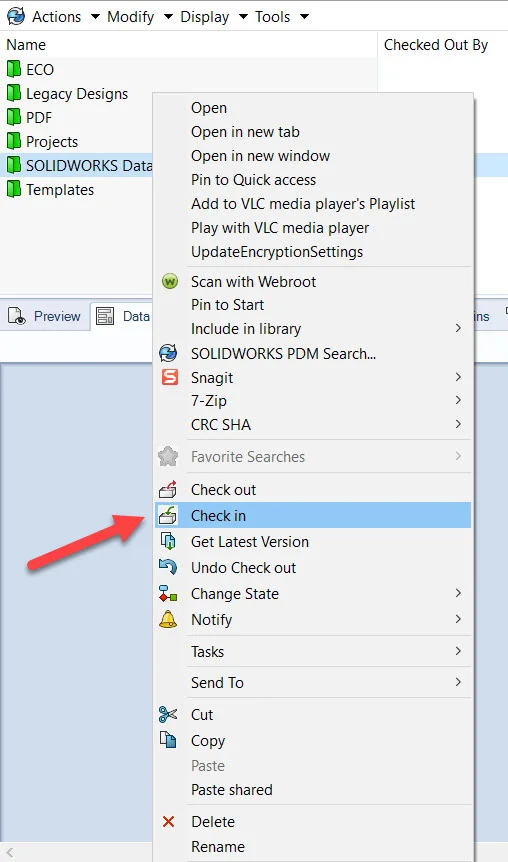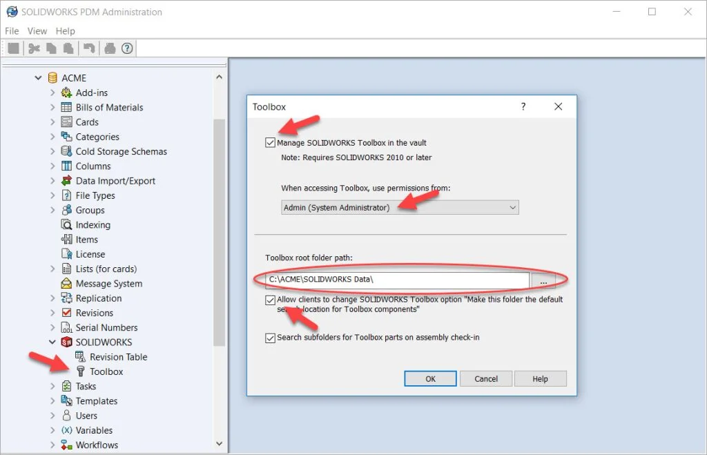 Copy and Check in SOLIDWORKS Toolbox - In SOLIDWORKS Administration Tool, Enable “Manage SOLIDWORKS Toolbox in the vault” and “Allow clients to change SOLIDWORKS Toolbox components option”
