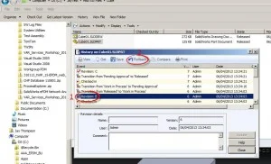But what happens if there was a mistake and something got released/approved that shouldn’t have been? How do you correct the problem and get back to the previous revision (including the previous revision letter)? One way to do it is using the “Rollback” command. You just right click on the file in Explorer View and select History. Then in the History window, select the version you want to revert to (1) and hit Rollback (2).