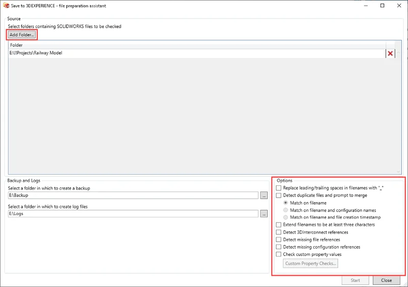 Once you launch the tool, select your folder with the top-level assembly that you want to upload from your desktop. There is no need to select its subfolder as the File Preparation Assistant will run checks on those as well. Then select the folder in which to create log files. In addition, I recommend you select a folder for a backup location.
