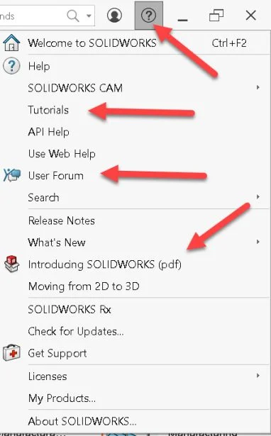 From the upper right hand corner of the menu bar, SOLIDWORKS provides access to help from the ? icon or F1 key. In the Help menu, access the Tutorials, User Forum (Community support), and Introducing SW .pdf.