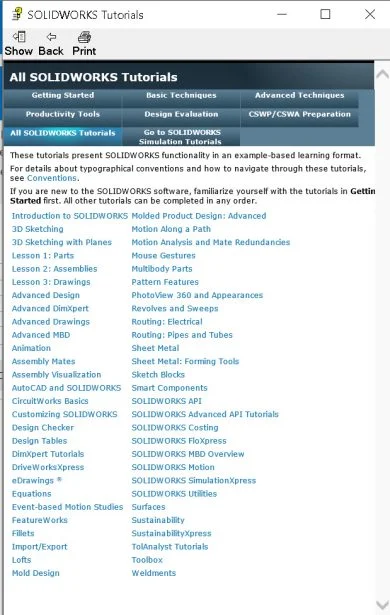 From the Help menu, F1, or ? in the upper right hand corner, inside of SOLIDWORKS, select Tutorials. When I first started teaching at Mass Bay College, my new students worked through Lesson 1 – Parts, Lesson 2 – Assemblies and Lesson 3 – Drawings. In one lab period, students got a basic understanding of SOLIDWORKS and CAD. Quick feedback and accomplishment made my students feel great.
