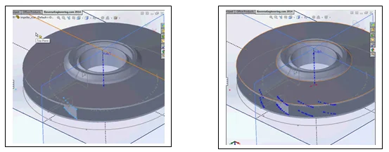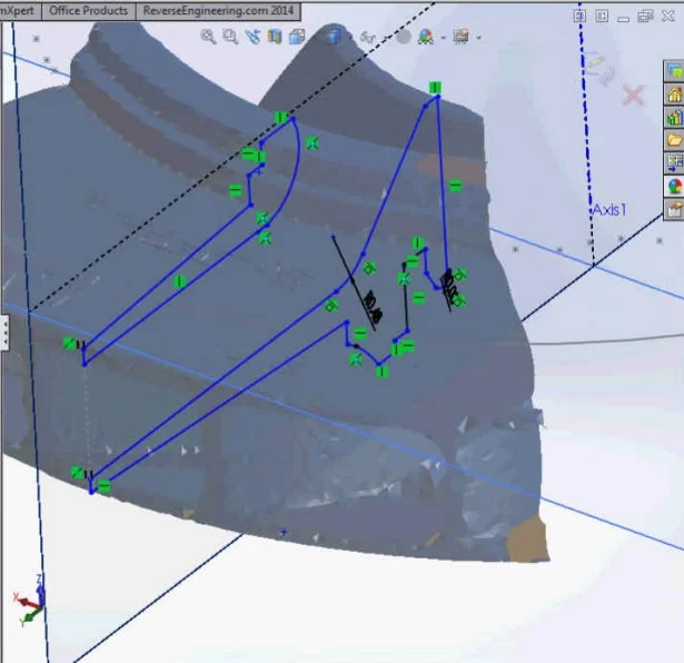 Reading the scanned file into CAD can easily be done in SOLIDWORKS Premium by choosing the “file read” task. The speed of the “file read” is relative to the size of your raw point cloud file. “Raw”, meaning a file as is, not cleaned up and very little post processing prior to sending it into your native CAD design software. Now that you’ve read the file into SOLIDWORKS this is where the real work begins. Thinking in reverse will be helpful at this point. Since the file is of a mold, model or part that has already been designed, an engineer needs to analyze the point cloud and look for those “hidden features” that are critical to the remanufacturing or the redesign of this point cloud.