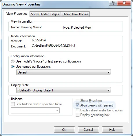 However, if the user wishes the parent and projected views to break at the same locations, the setting is located for the projected view in its PropertyManager>More Properties… button>Align Breaks with Parent check box.