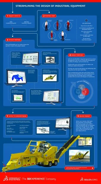 SOLIDWORKS can help engineers and machine designers streamline the development of industrial equipment as they go through each step of the design-to-manufacturing process shown below. Click on image to see full-size infographic.
