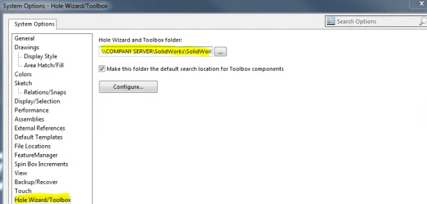 Once the SOLIDWORKS Data folder has been moved it will be necessary to point all client installations to the server toolbox. To do this simply go in tools->options->system options->Hole Wizard/Toolbox and change the path to the server location as shown in the image.