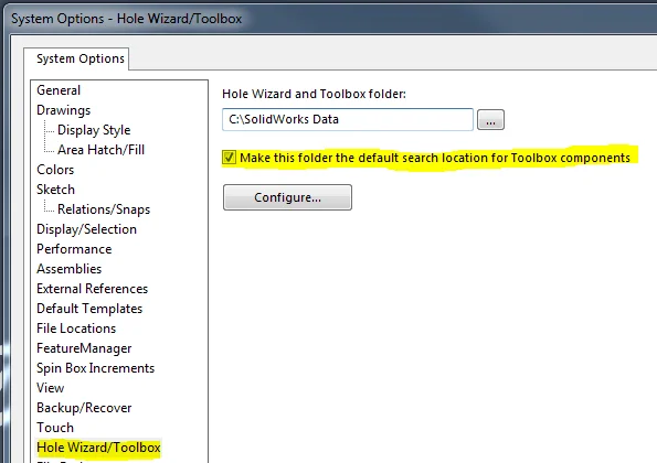 A problem that can arise from having multiple toolboxes installed on the same machine is where SOLIDWORKS opens the toolbox files from. If it is not opening the toolbox file from the active toolbox folder (the one specified in tools->options->system options->Hole Wizard/Toolbox) and the configuration of toolbox file does not exist in that folder, then it will not automatically create the configuration and revert to the default (preview cfg) configuration. If you’ve ever opened up an assembly and seen that the toolbox files are unusually large – this is probably what has happened.