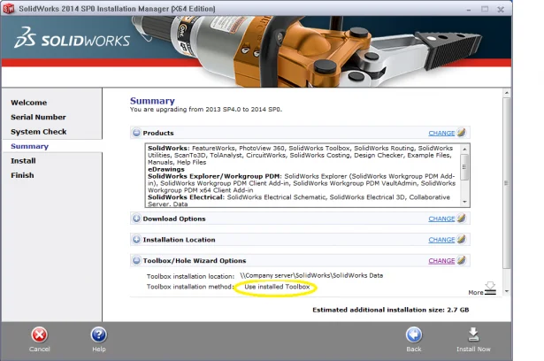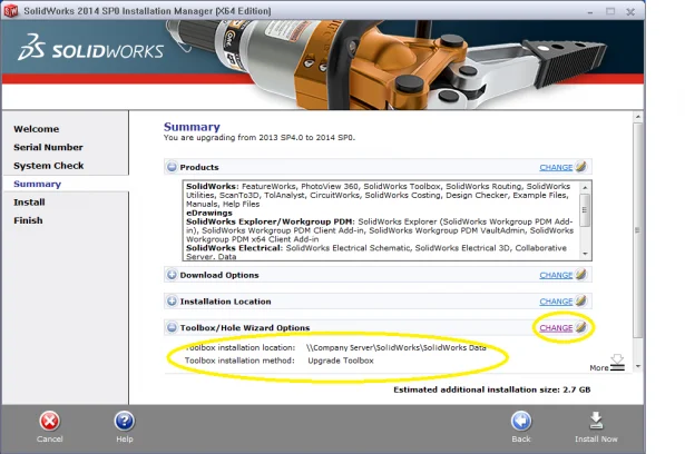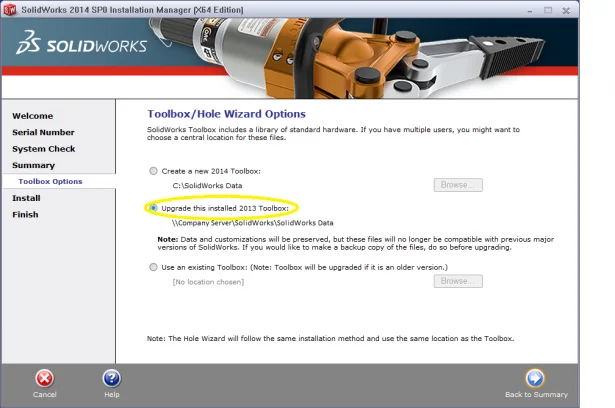 To get to this page, click change on the summary page next to ToolboxHole Wizard options. Once you have selected to upgrade the toolbox, click back to summary and the changes you have made will be shown as per the image.