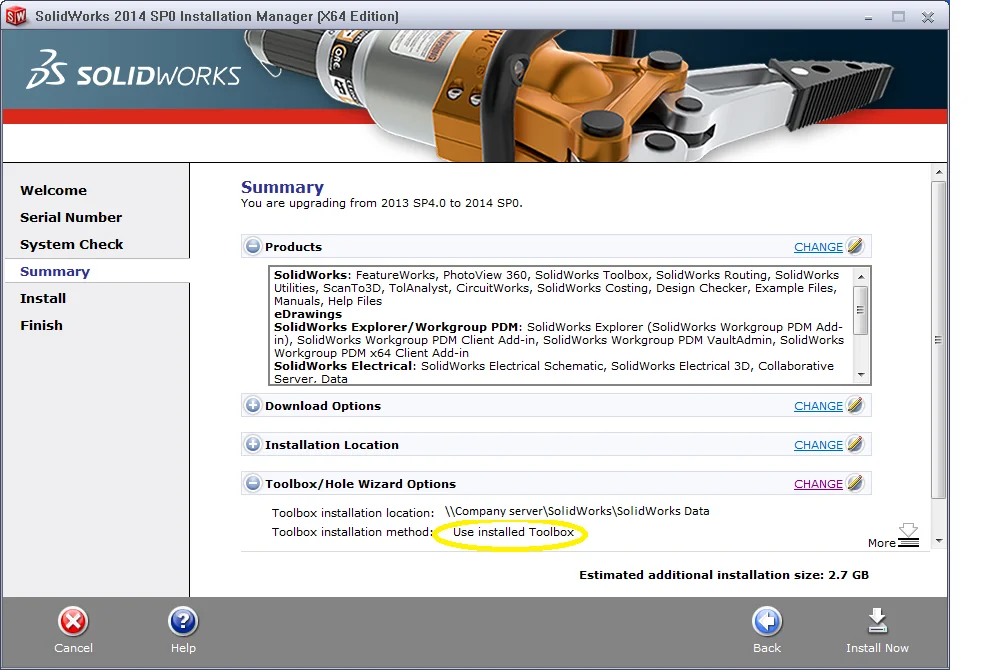 The toolbox is installed automatically when installing SOLIDWORKS professional or above. The default location it installs to is C:SolidWorks Data, but this can be changed during the install or alternatively you can move the entire SOLIDWORKS Data folder to the server after the install. In fact I would recommend moving the folder after because there are likely to be less issues with permissions and the install will be quicker because you are writing to the local machine
