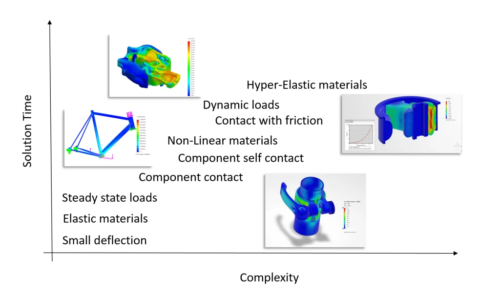 To the casual observer it may seem that all structural simulation is the same. Model your components, apply materials and some loads and away you go. Sadly, that isn’t always the case. As with all things complexities arise as more conditions and behaviors have to be considered. To my mind, structural analysis ranges from the straightforward to brain scathingly difficult. Taking a simplistic view, and ignoring many aspects of structural analysis, I have ranked some of the basic tasks: