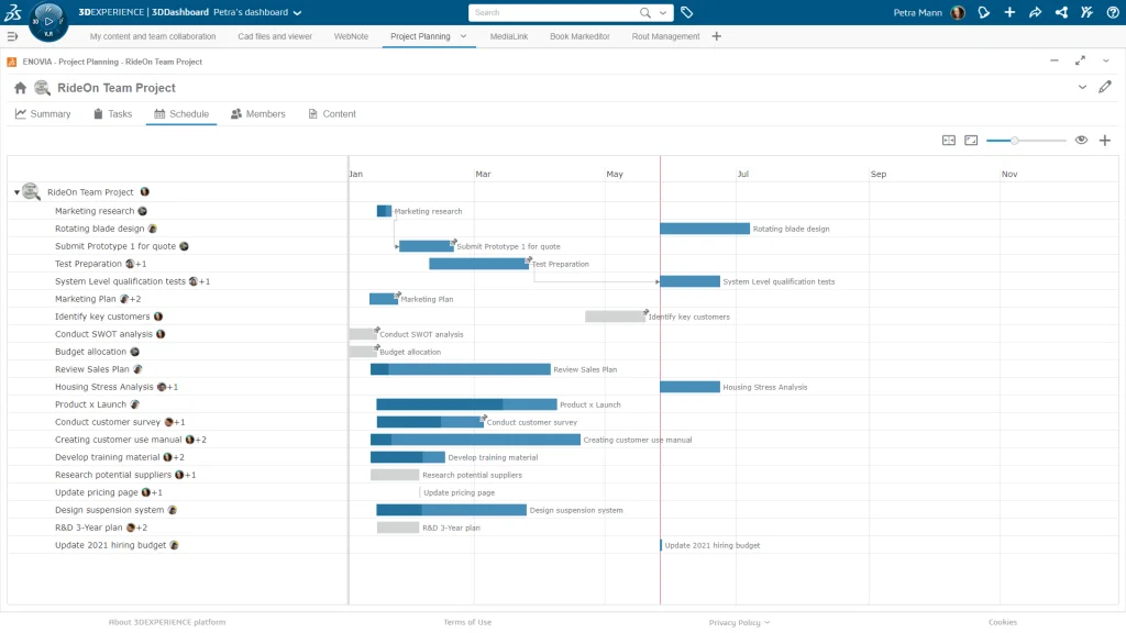 Using Project Planner in conjunction with the other planning roles (such as those above), you can leverage the 3DEXPERIENCE platform to manage the product portfolio from the market-information gathering stage to final product delivery. Product issues identified by market monitoring and analysis tools can be seamlessly communicated to Engineering via the platform. Project Planner is also equipped with built-in CAD viewing capabilities that do not require additional plug-ins, so key stakeholders can easily participate in the review process at any stage. Any team member can monitor progress while on the go, receive project notifications, and access project content from any location.