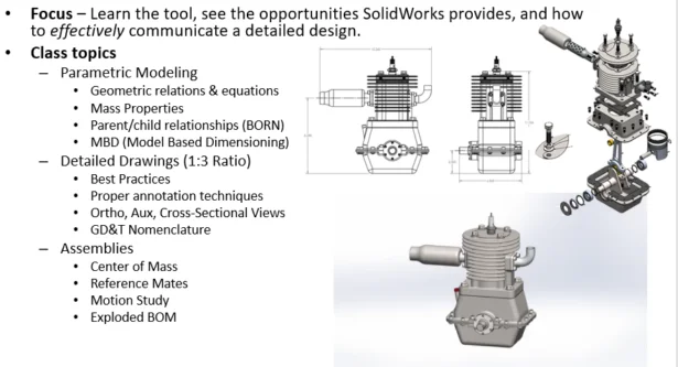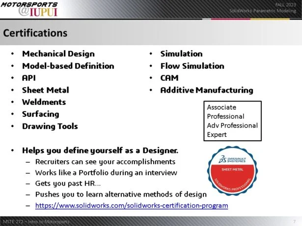 Garrett: I teach “best practices” for motorsports. Learn the tool and see how to effectively communicate a detailed design – accurately. Students take the Certified SOLIDWORKS Associate exam for their first industry credential.