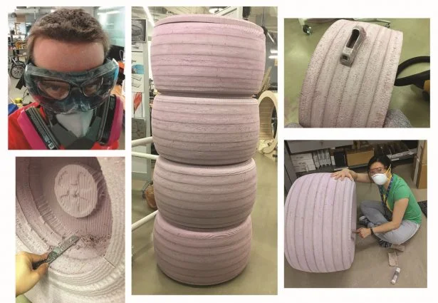 The wheels of the mini-Max-D are eight layers of foam, designed to have a matching inside diameter. There was no point in matching up the outside, since those sides would be sanded down. A finished wheel is about 17” wide and 28” in diameter—because we like doing things to scale at SOLIDWORKS. Now that they’ve been machined, the transformation into treaded, realistic monster truck wheels has begun. After the wheels are glued and screwed together, they are sanded and primed. Black rubber has been laser cut to resemble treads, and the wheel flowers are blooming into incredible costume pieces!