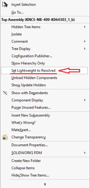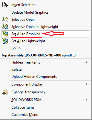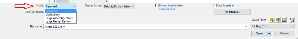 There are 4 different ‘modes’ that an assembly can be opened in, as seen in the image below; Resolved, Lightweight, Large Assembly Mode and Large Design Review, each opening the file in a different state.