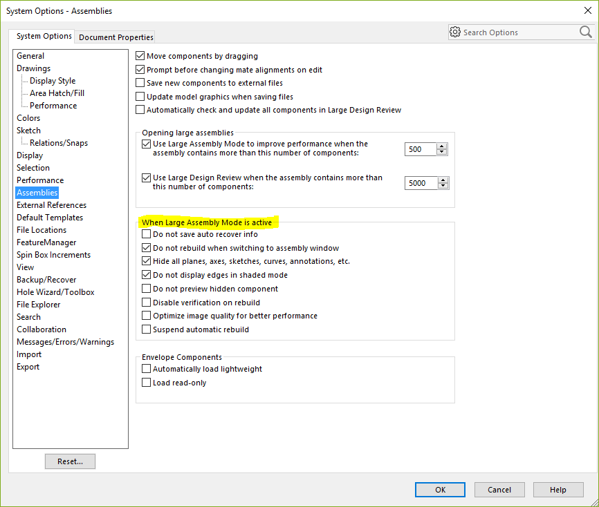 Performs the same process as the Lightweight mode option above, however, it involves a few more options that can be altered as seen in Image 2. Each option restricts particular processes and features to aid performance. These options can be accessed via: Tools > Options > Assemblies.