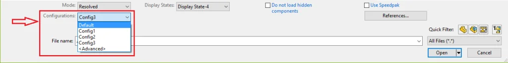 Another technique you can use to improve navigational performance is to create a configuration within the assembly, suppressing some unnecessary associated parts and subassemblies. For example, many configurations may be needed for a different combination of the components within the main assembly. These can then be loaded upon the file opening if chosen on the open dialog box as seen below.
