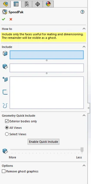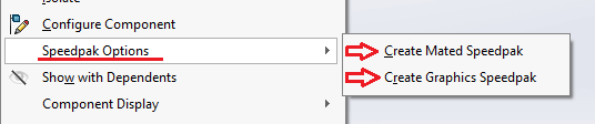A SpeedPak configuration reduces the file size by limiting the file to specific faces or bodies. These faces are required for mate referencing only. You can either create a SpeedPak at top level or within the subassembly, each providing you with different options as follows: