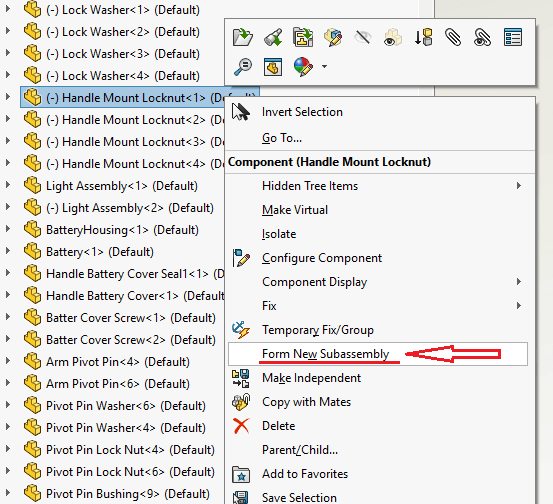 In order to begin this process, you need to RMB on the relevant part you want to be included within the subassembly and select ‘Form New Subassembly’ as seen below.