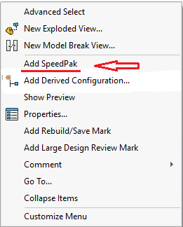 The SpeedPak configuration at subassembly level can be created in the ConfigurationManager via the right mouse button (RMB) as seen in Image 6. The aim is to remove all but the information required (faces, associated mates, etc) to maintain the references at the top level. This then becomes a derived configuration which has to be activated at top level.