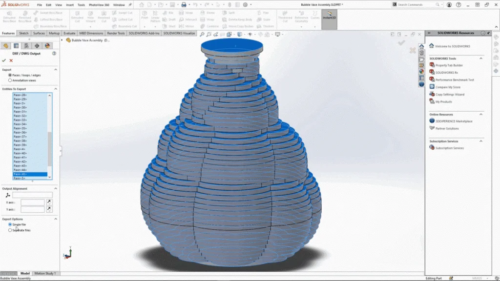 When the part file is opened, all of the part files will come in as separate bodies, making it a multi body part. From here, I could use the combine tool with operation type on add, and select all the solid bodies to combine them into one. To prepare the model for laser cutting, I needed the outline of each layer. This would take a long time to do individually selecting the edges, and would not be possible to do before combining all the bubbles to the vase. To do this quickly and send out all of the DXF files in one go I used the split tool. The sketch was created quickly using the linear sketch pattern, spacing split lines 5mm away from each other. Then when the vase is split with the sketch, 45 solid bodies are created.