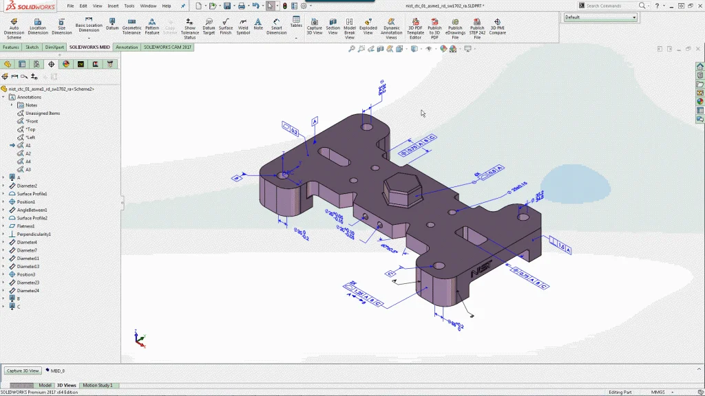 With SOLIDWORKS Model-Based Definition, annotations and dimensions can be aligned and oriented with ease. Check out NIST’s PMI test cases here.