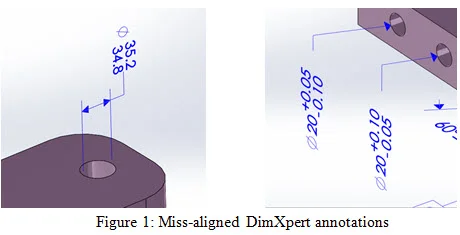 SOLIDWORKS DimXpert offers a custom text position feature that allows users to orient a dimension to more readable formats. With this new enhancement those poorly oriented dimensions that are seen below can be fixed in an instant.