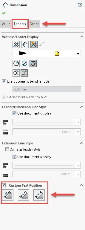 To find and use this wonderful feature, simply select any DimXpert annotation or callout contained in the SOLIDWORKS environment. Within the DimXpert property manager under the leaders tab, users will find the custom text position options at the bottom.