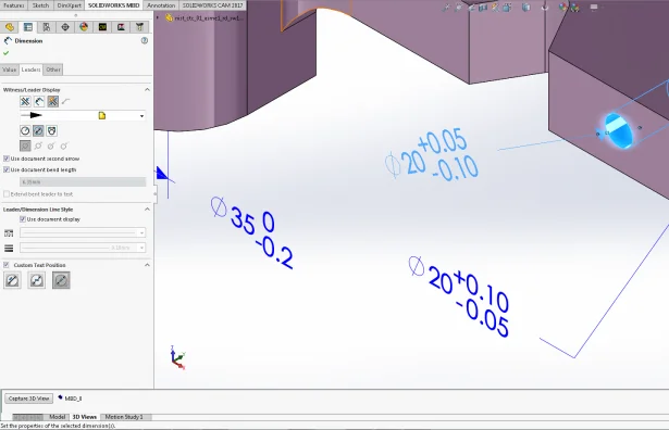 This option is very similar to option one except the leader does not extend underneath the annotation. Both the annotation and the leader will be aligned along the same axis. The custom text position feature is a very valuable tool in aligning DimXpert annotations to fit your needs. Every model is different in its own way and to account for this, SOLIDWORKS MBD needs to be versatile in the way it orients and displays product manufacturing information. With this handy capability, MBD is one step closer to giving users a seamless journey between design and manufacturing. Check out this quick video showing the functionality of custom text positions.