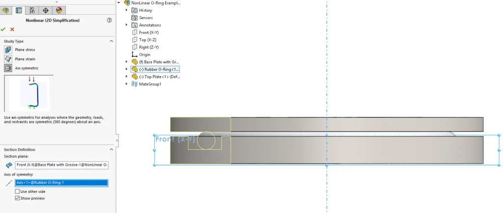 Once 2D profile is selected, SOLIDWORKS Simulation will automatically create it for the analysis. Here, a translation is applied to the edge of the top plate to ensure both plates coincide to compress the O-ring.