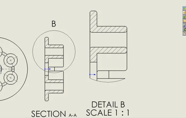 - Creating section views of a 2D angle of the part is as simple as using the View Layout Tab, clicking the center line of the view you want, and sliding the section away from the original drawing. The same steps are used for a detailed view also.