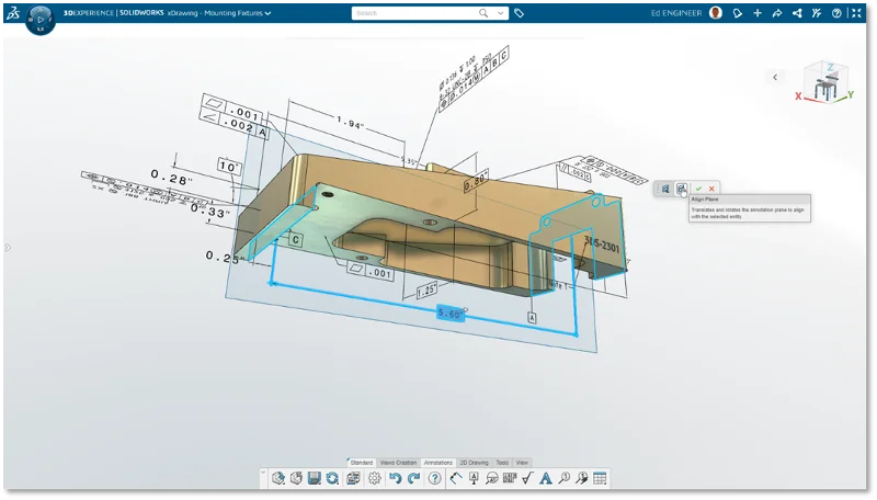 In this release, you’ll want to take advantage of the new feature to align a plane that can be found in the Align Annotation command. The Align Plane feature enables you to snap a plane to geometry and other annotations. You know how you can manipulate an annotation plane by dragging the arrow and by pushing it or pulling it on the ruler to precisely position that annotation. The Align Plane feature will help with that as it will enable you to snap the annotation to any geometry or existing annotation.