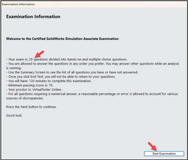 Click Start Examination. Note: Timing yourself is crucial. One exam strategy is to answer all the hands-on questions first within 90 minutes. Here you will gain the most points. Leave 30 minutes to answer the multiple choice yes/no, and multiple answer questions. Use SOLIDWORKS Simulation Help during the exam.