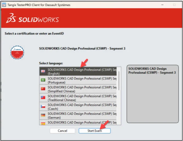 Select SOLIDWORKS CAD Design Professional (CSWP) – Segment 3.