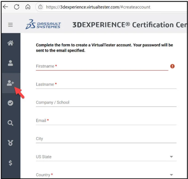 The third icon on the left side is to create a VirtualTester account (school email address is required). This is where your students go to create their personal account (to login to the 3DEXPERIENCE Certification Center Home page. Note: It is highly recommended that the student VirtualTester account is the same as their 3DEXPERIENCE ID Platform account.