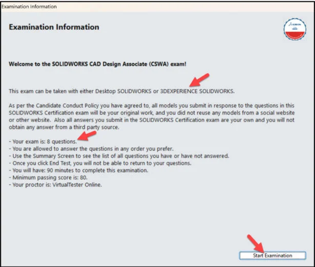 Lesson 7 covers general information, content and taking the on-line proctored Part 2 of the SOLIDWORKS CAD Design Associate (CSWA) Certification exam. Part 2 of the exam is 90 minutes; minimum passing score is 80 with 8 questions.