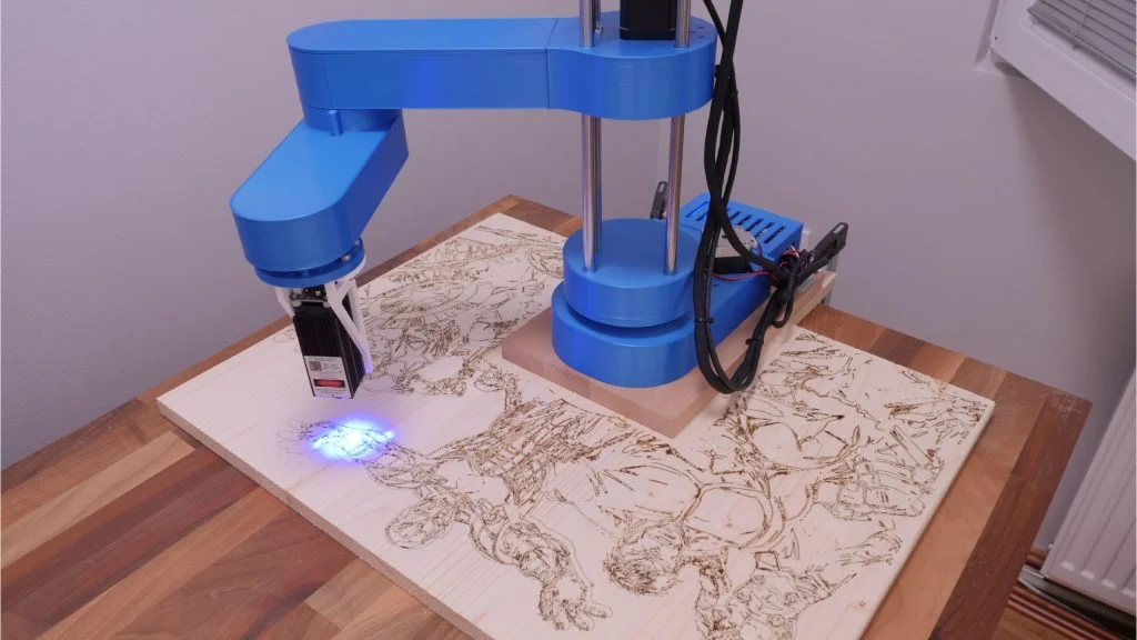How to Mechatronics plugged back in to make a branch off version of the pick and place SCARA robot this time around, adding the laser engraving capabilities. If you’re familiar with the original SCARA build, you likely recall many of the components are 3D printed, and there’s lots of belt/pulley work to get the robot to move appropriately within its degrees of freedom.