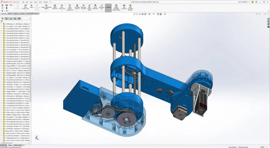 Well, in this video, How to Mechatronics can be seen using 3DEXPERIENCE SOLIDWORKS Professional, a cloud-connected version of SOLIDWORKS 3D CAD that is included in the low-priced 3DEXPERIENCE SOLIDWORKS for Makers offer (and sold for commercial use cases as well). You may remember, if you are an avid reader of the SOLIDWORKS Blog, that Dejan designed the first version of the SCARA robot to perform pick and place commands.
