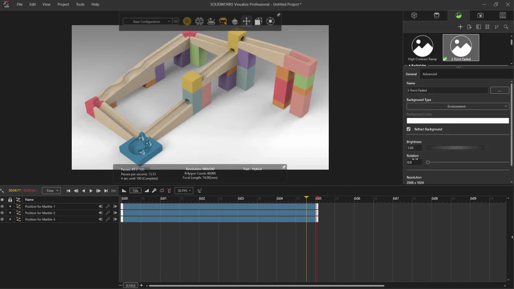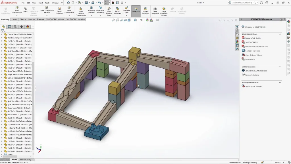 Once all 10 track pieces are done, I added stained wooden appearances to each before re-saving the parts and closing them ready for the assembly. When creating the assembly, it’s always easier to start with the end track and work up, I added components in stages to overwhelm myself with parts to mate. Ensure that all the parts are fully mated in place, so they don’t move as you’re adding more parts too. With the marble run fully assembled I fix all the track parts ready for the motion study. If you don’t fix these parts, they may just fall through the floor of the assembly, doing this also ensures that they don’t interfere with the analysis. The marbles are dropped into the assembly at the top of the starting track block and are mated with a tangent mate, but only temporarily for placement.