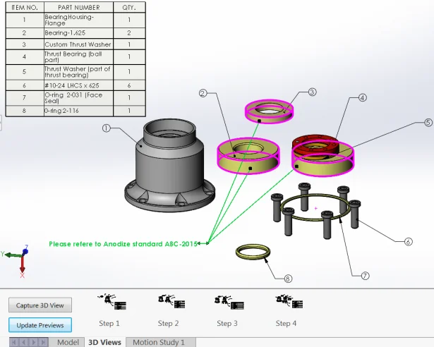 Another recommendation is to integrate all specifications into 3D. If key manufacturing information, such as notes and bill of materials (BOMs) tables can only be found in 2D, instead of 3D, it creates a dependency on 2D and invites objections. The good news is SOLIDWORKS MBD supports many manufacturing specifications in 3D already besides dimensions and tolerances, such as BOM, Notes, and Balloons as shown below.