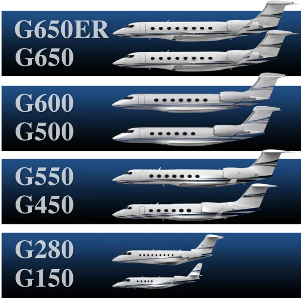 Founded in 1958, Gulfstream has become the leader on business and private jet design, manufacturing, and service. Its focus is on air frame and completion. The images below show its fleet today and a typical jet cabinet.
