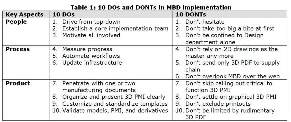 These are all profound questions that need comprehensive and practical answers. Let’s take one step at a time by first learning from pioneers’ experiences and lessons. Table 1 summarized 10 DOs and DONTs in MBD implementation based on experiences of dozens of manufacturing businesses around the globe. This blog series will dive into these 20 key recommendations categorized into three key aspects: