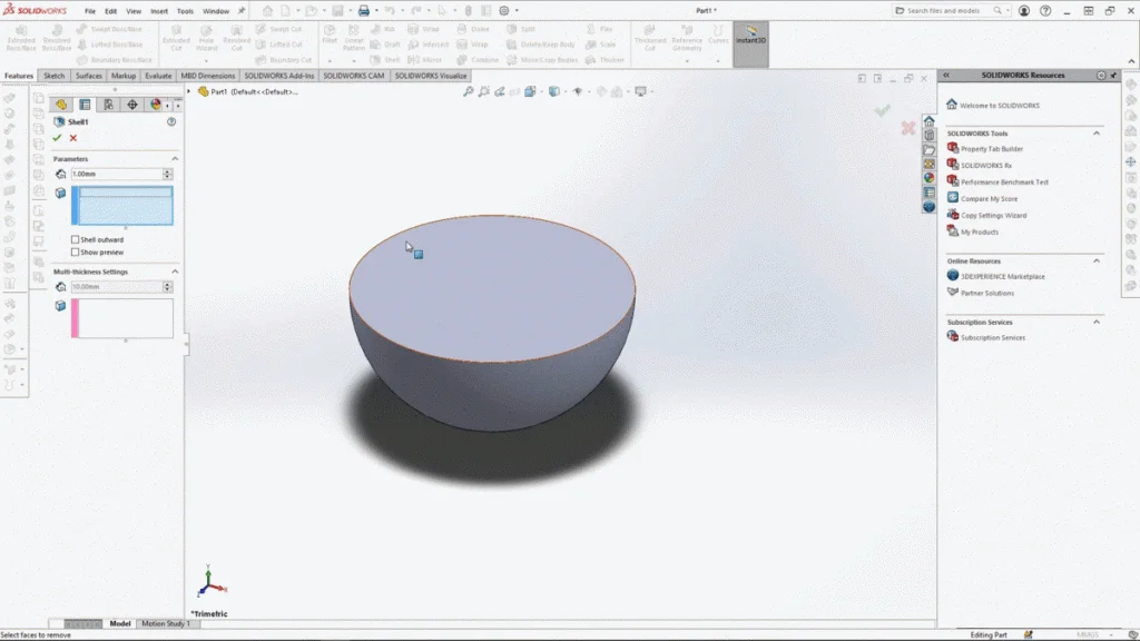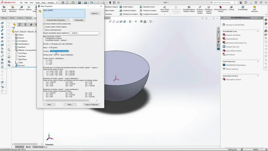 Once the spoons volume was created using the revolve tool and checked with mass properties, the shell tool was used to create the outer scoop of the spoon. By selecting the top face of the revolve and the shell feature, the thickness of the shell was chosen, but shell outward is selected, this causes the walls to shell outward by the desired thickness, with the inner mass disappearing to leave a spoon scoop to the volume created.